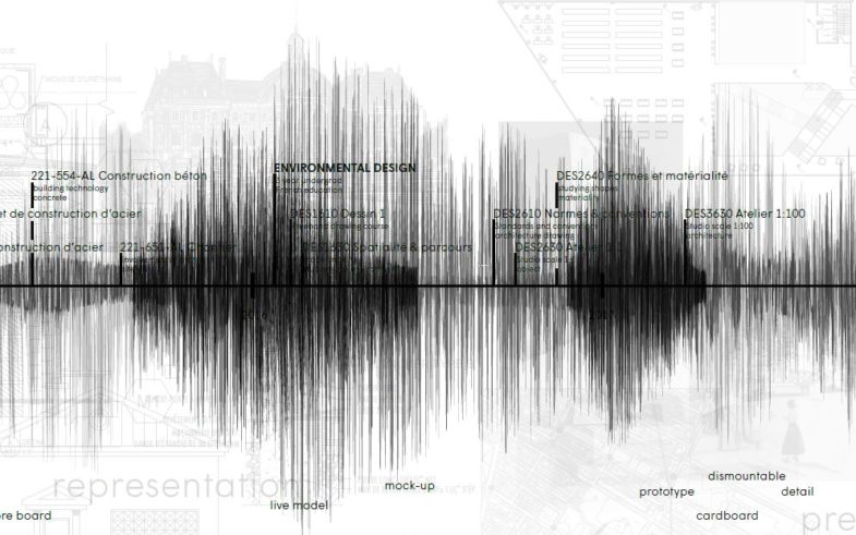 Around a timeline, I have pulled courses and events that I believe had great importance into my education and life. Layered to that, I have mapped out my emotions throughout this portion of my life (2013 to now). These emotions, depicted by this sort of “sound wave” effect, are excitement, confusion, and anxiety. They mainly refer to how my body and my mind reacted to different elements such as courses, profs, school application, the waiting, online courses, etc.