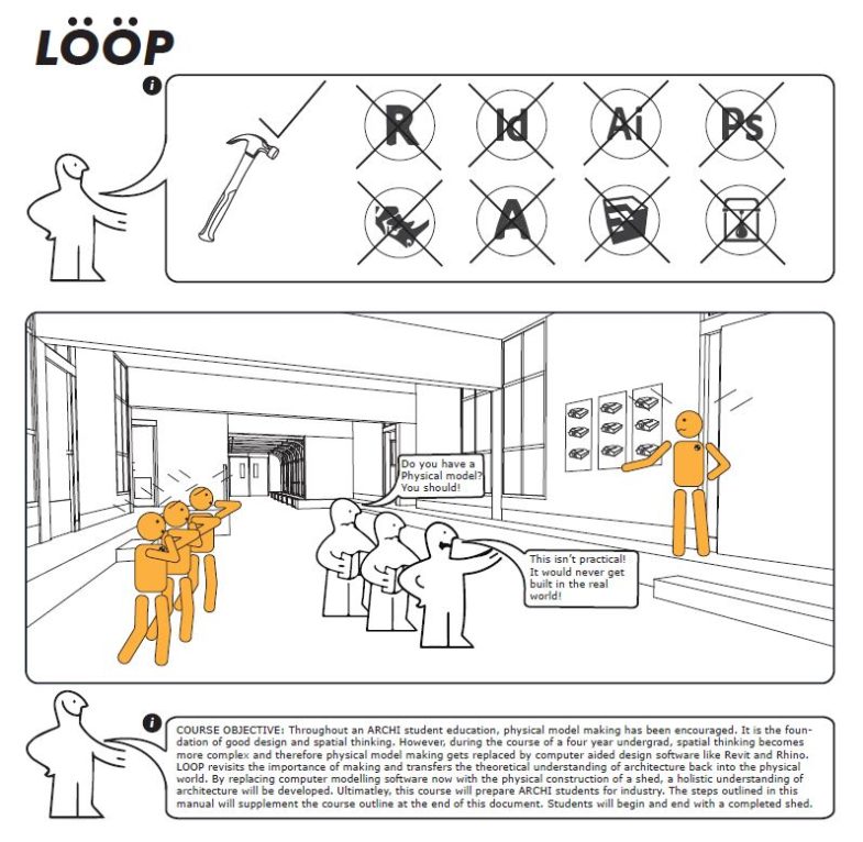 In the Prejudice Project, back-looping is explored through a course entitled Loop – Deconstructing the Prototypical Shed. In this course, students will learn architecture through a reversal in learning. Rather than following the traditional cycle for an architectural project where one draws, builds, and demolishes, students will start with a completed shed and deconstruct it. Through this process of reversal, the void of architectural knowledge left from years of emphasis on design will be put aside for material lifecycle management, recycling and construction. It will also force students to learn by making – reinforcing the knowledge they have theoretically understood through drawing joinery details in previous classes but with a more tactile and practical approach.