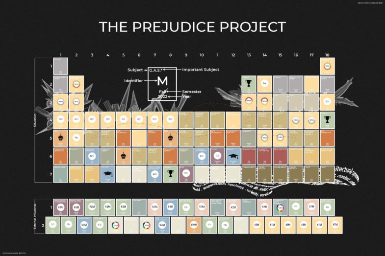 Recollecting my findings, I reorganized the information in a combination of a timeline and categorization. The inspiration for this periodic table format emerged from the previous digital layout of squares. These “elements” are then grouped into subcategories while following a timeline that runs left to right, top to bottom. The lower section a subgroup of personal and external events that correlate to my overall educational experience. In the final iteration of my narrative arch comes a new presence of form. I revisited the periodic table design and entered elements from the next phase of work. The linkage between these different forms creates a subtle shift in direction. Instead of viewing my educational background on paper, it would now be introduced as a physical game that can be shared.